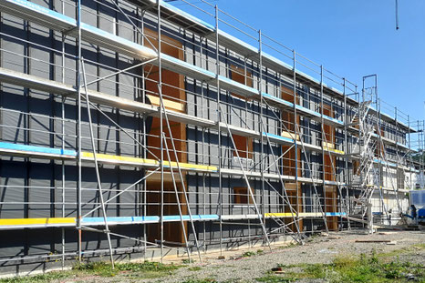 Für insgesamt 10 Wohnungen mit Mehrzweckraum ist der 3-geschossige Holzbau errichtet. Jetzt folgen die Ausbaugewerke.